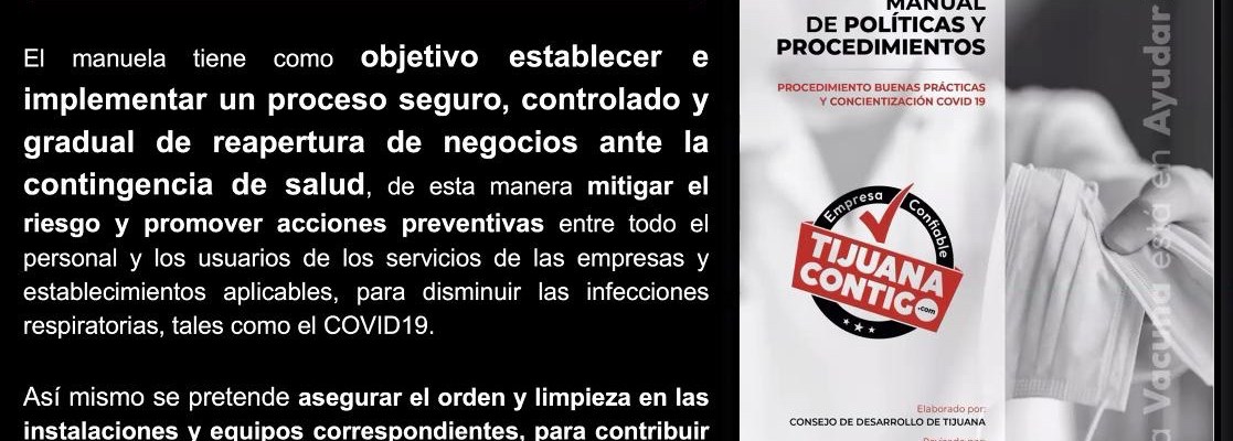 Para ello se trabajó en coordinación con el proyecto «Tijuana Contigo» en la elaboración de un manual de políticas y procedimientos de buenas prácticas y concientización Covid que fue presentado durante la conferencia semanal virtual del organismo.