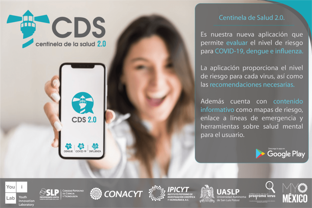 La nueva app Centinela de la Salud (CDS 2.0), desarrollada por especialistas del You I Lab y la División de Biología Molecular del IPICYT, en coordinación con la Universidad Autónoma de San Luis Potosí y los Servicios de Salud del Estado, determina los grados de riesgo individual para dengue e influenza, además del que determinaba inicialmente para COVID-19.
