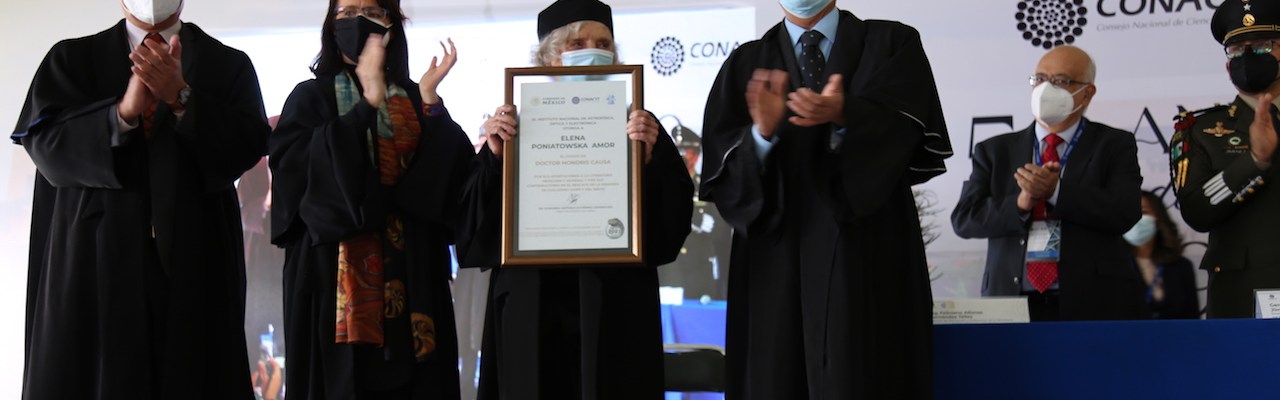 Santa María Tonantzintla, Puebla, a 12 de noviembre de 2021. Por sus aportaciones a la literatura mexicana y mundial y sus contribuciones en el rescate de la memoria de Guillermo Haro Barraza y del Instituto Nacional de Astrofísica, Óptica y Electrónica (INAOE), este día se otorgó el Doctorado Honoris Causa a la escritora Elena Poniatowska Amor, en el marco de la ceremonia por el quincuagésimo aniversario de la fundación de este centro de investigación.