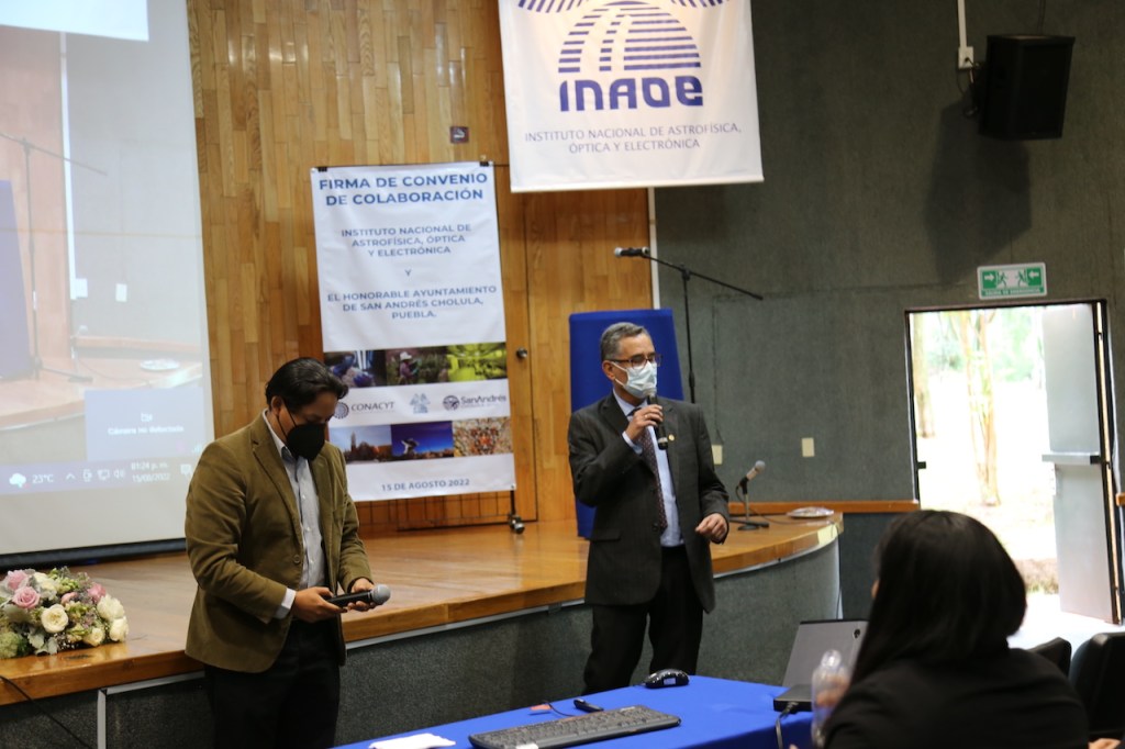 Santa Maria Tonantzintla, Puebla, a 15 de agosto de 2022. Con los objetivos de profundizar los lazos de colaboración entre el Instituto Nacional de Astrofísica, Óptica y Electrónica (INAOE) y el Ayuntamiento de San Andrés Cholula y beneficiar a la sociedad sanandreseña, este día se firmo un convenio marco de colaboración entre ambos organismos.