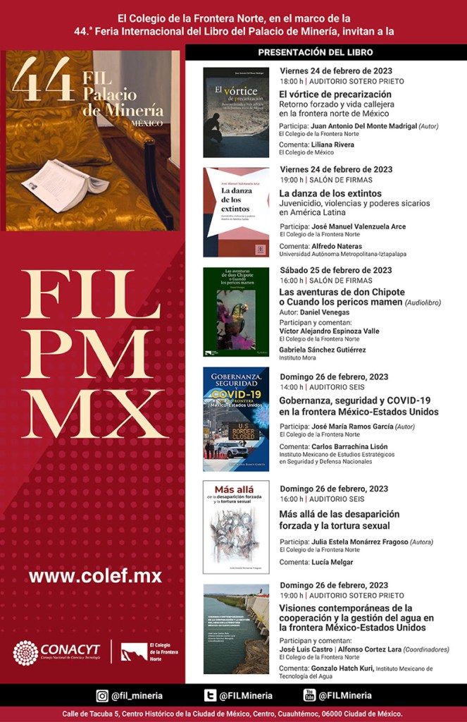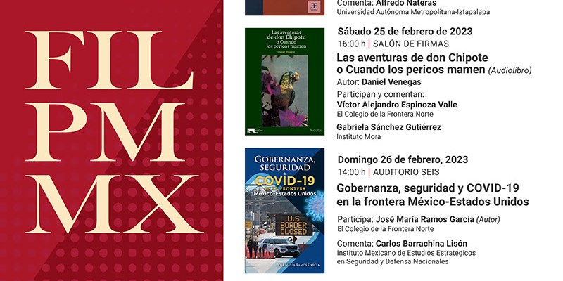 El domingo 26 de febrero, el auditorio Seis contará con dos presentaciones. A las 14:00 participará José María Ramos García (El Colef), con Carlos Barrachina Lisón (IMEESDN) como comentarista, con su libro “Gobernanza, seguridad y COVID-19 en la frontera México-Estados Unidos”.
